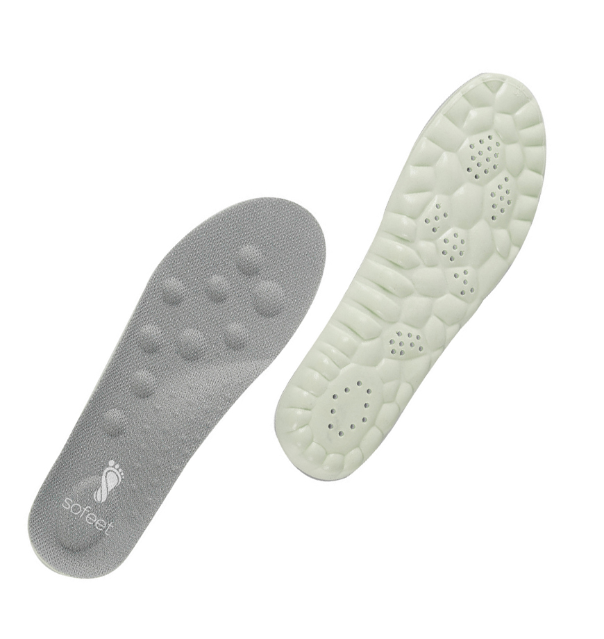 - Con un innovador sistema de masaje, los puntos elevados regulares en la parte superior de las plantillas actúan como una técnica de acupresión, proporcionando un masaje que alivia la fatiga en las piernas y reduce la presión en los pies,